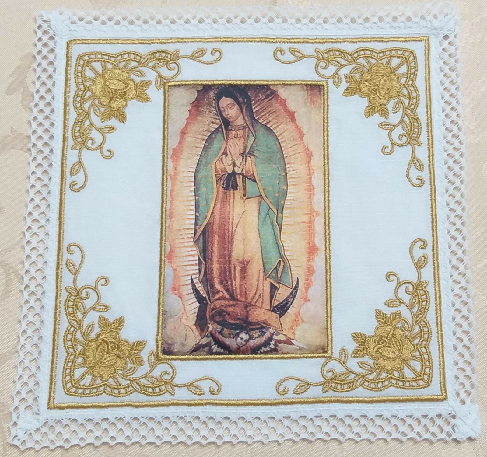A pala é confeccionada em cambraia de linho puro, com acabamento em renda de algodão e imagem de Nossa Senhora de Guadalupe sublimada no cetim e aplicada no linho com bordado em dourado.